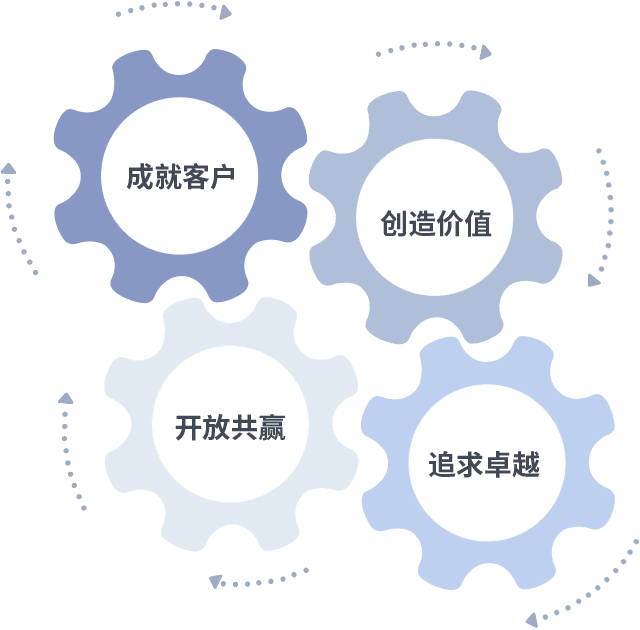 成就客户是一切决策的出发点,,,创造价值是衡量所有工作的标准,,,追求卓越是我们做事做人的态度,,开放共赢是我们的格局也是最终的结果。。价值观的齿轮环环相扣,,,,推动着组织里的每个人不断向前。。。
